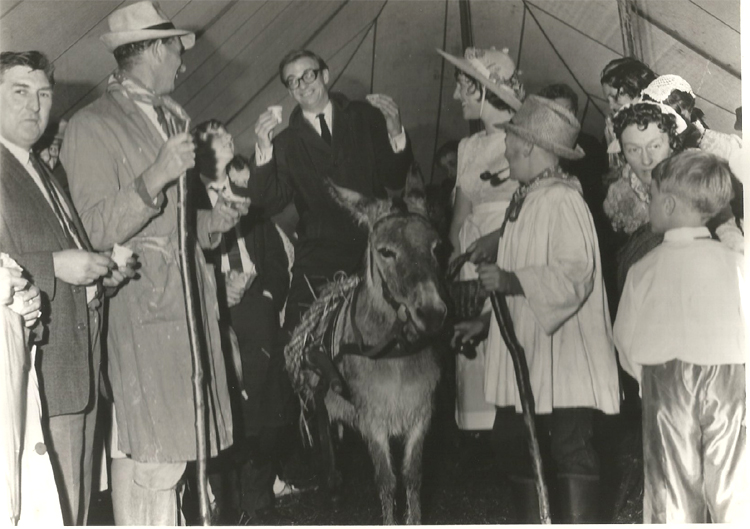 1966 – A young comedian Roy Hudd enjoys a cuppa & an apple pie in the marquee (it must have been a wet day!)