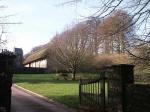 the outer entrance gates to the castle, with the 18th century barn in the background