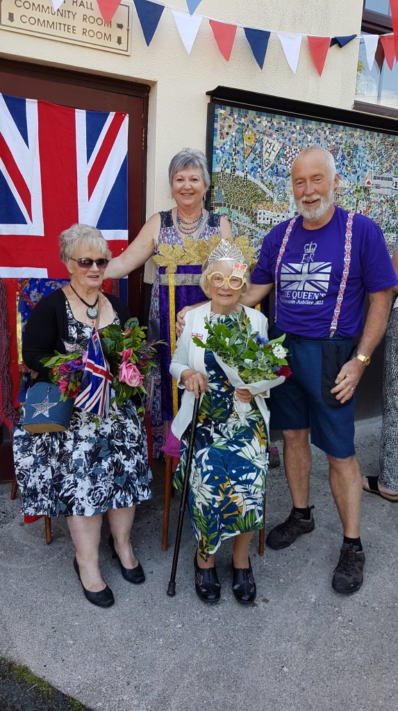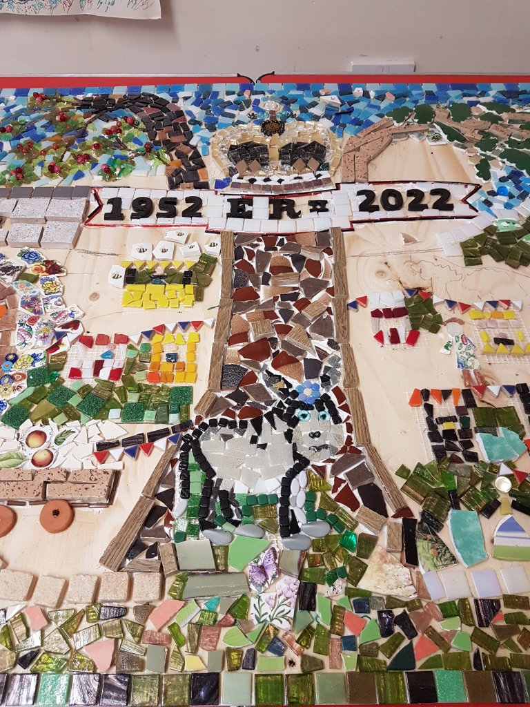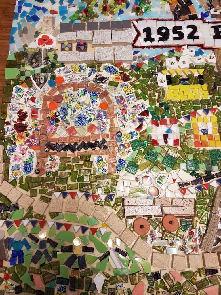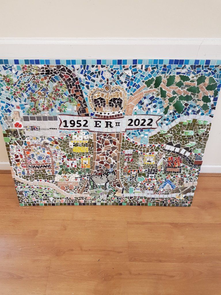 A group was formed to create a Mosaic which is now sited on the Village Hall to commemorate the Queen’s Platinum Jubilee in 2022 and the history of the village for the past 70 years. Every member of the village has been invited to contribute to this project in whatever way they can. If you have seen the mosaic you will know that there is so much detail, let me walk you through our journey and the mosaic.