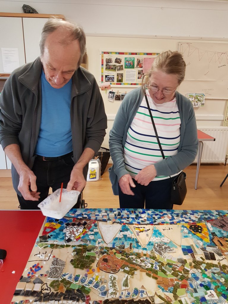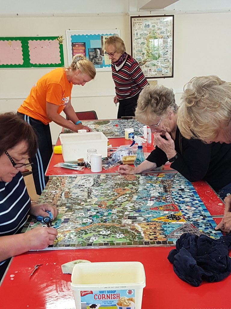 Things to see if you can spot in the mosaic are other bits of bunting, a cat, a dog, blue flowers (gentians), 3 different types of sheep, birds,a butterfly and of course the strawberry to represent us mosaicers who ate an awful lot of cake when making the mosaic! We hope you agree it was worthwhile we certainly had a lot of fun doing it and forged many new friendships along the way.