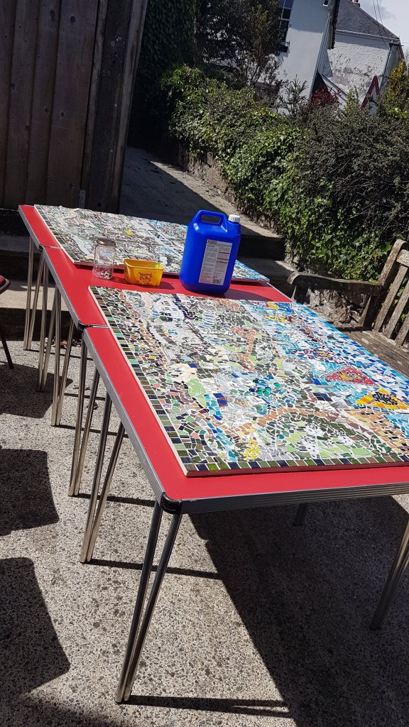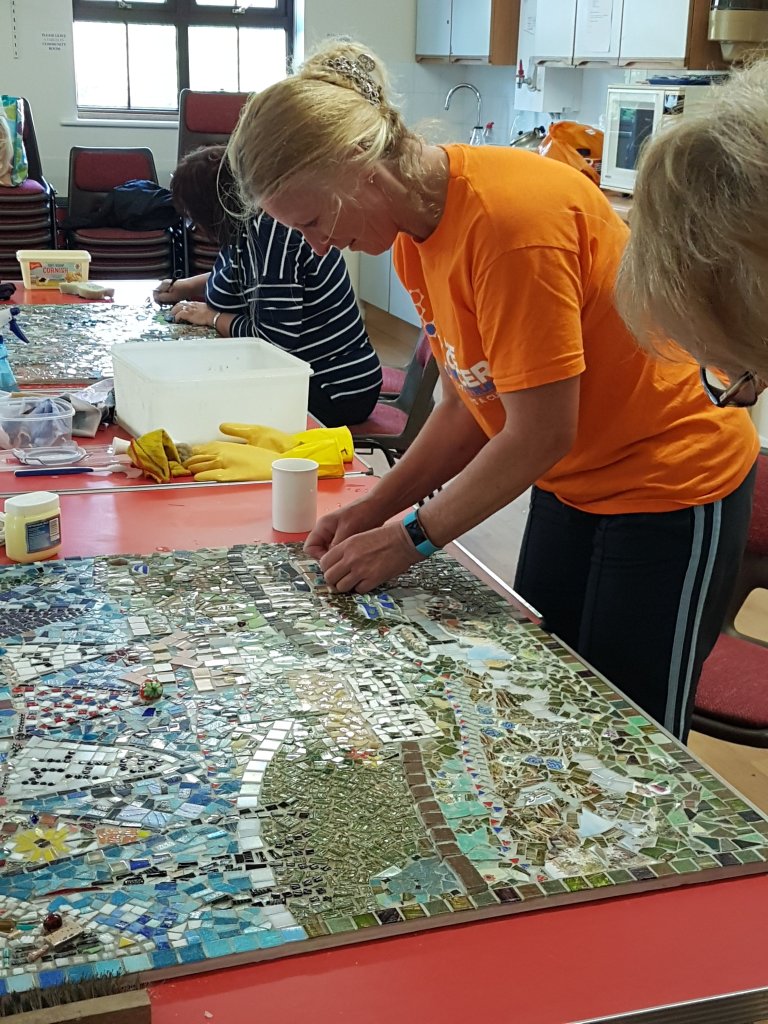 We invited anyone in the village who wanted to be part of the mosaic to come along and add either just one piece or a whole section and for me that has been part of the magic, we have had a huge number of people take part from babes in arms to elderly people and so many stories are woven into this picture I couldn’t begin to tell them all and some are very personal so not appropriate to share, suffice to say there are stories of love, life and death that only the creators know about. We have had bits added to celebrate births, to remember people long since past, to record a moment for those struggling with terminal illness, to celebrate love, bits that mean something to people because of their connection and bits added by children that they one day will be able to show to their children. Our motto has become “So much more than wood and broken pieces. Piecing together as a community”
